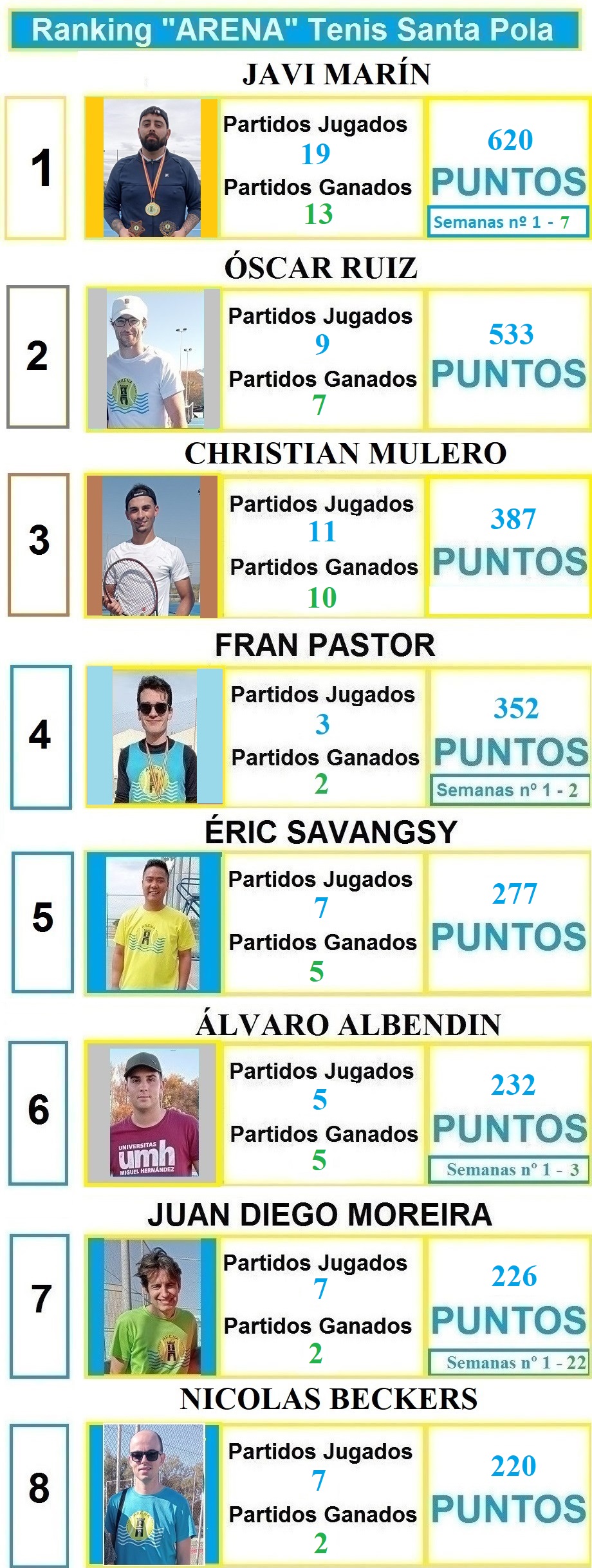 | 1 | Javi Marín | 266 | 182 | 85 | 19 | 13 | 6 | 27 | 17 | +10 | 186 | 164 | +22 |