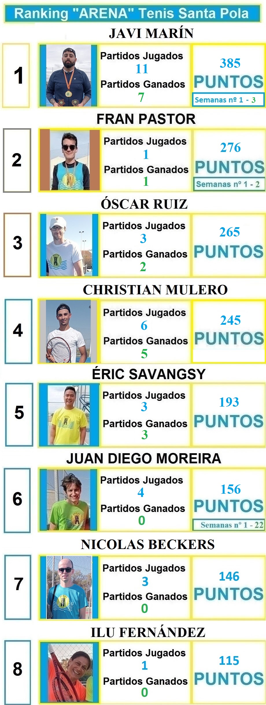 | 1 | JAVI MARÍN | 385 | 11 | 7 | 3 |